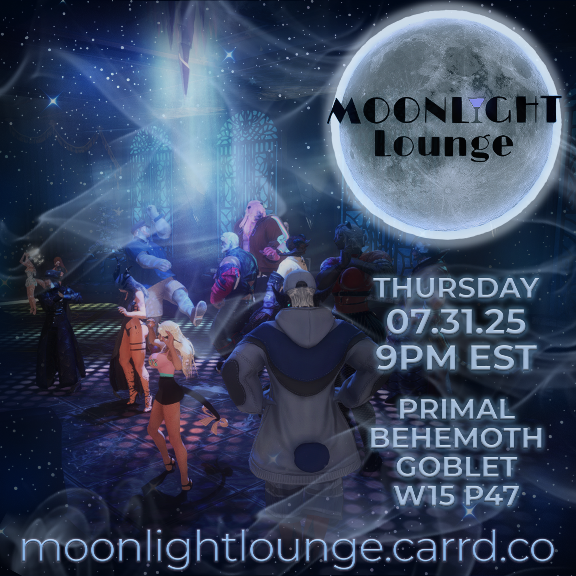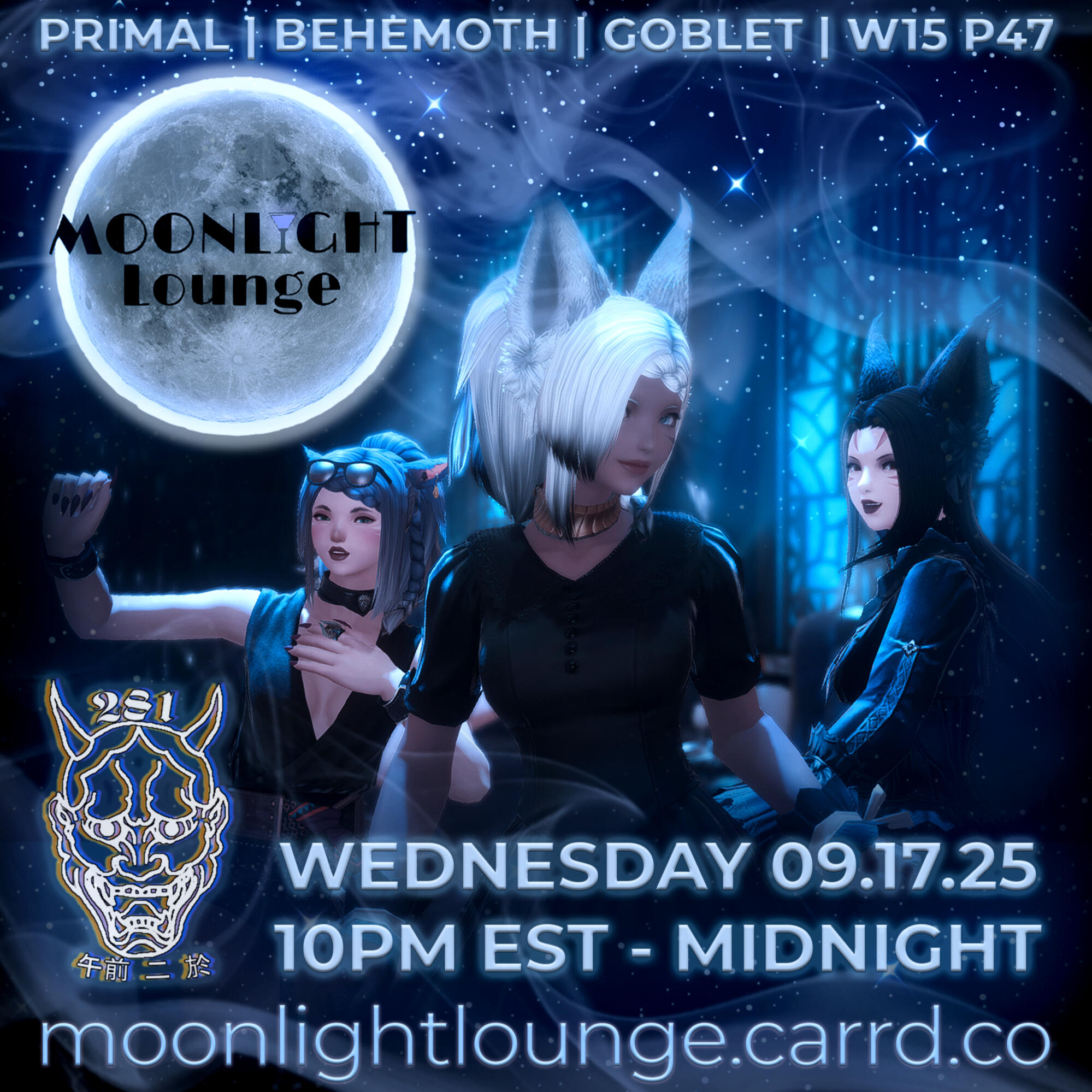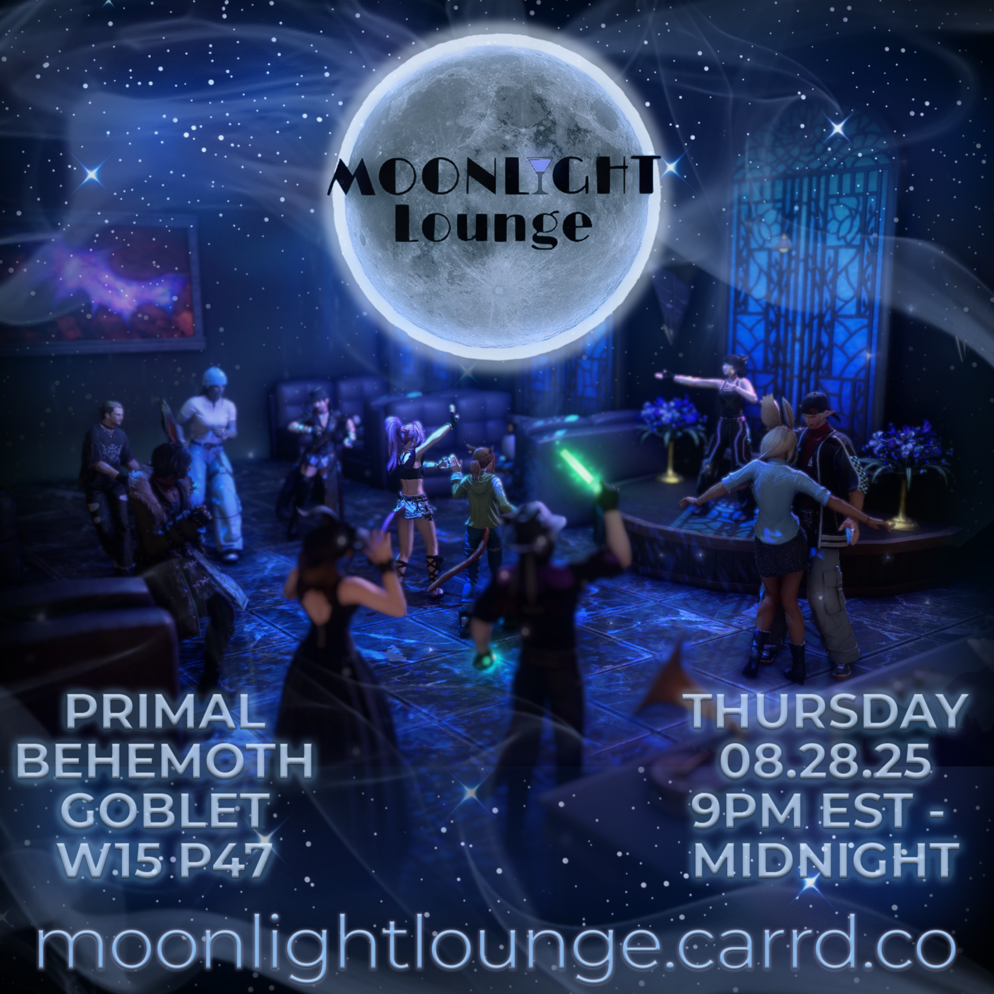 In the late summer of 2023, a humble cat, known for his gamba card-slinging and love of bard bands, created a serene space for friends to gather, relax, and find sanctuary. Whether they required reprieve from their day-to-day lives on The Source or from realms beyond the reach of Hydaelyn's light mattered not. The Moonlight Lounge was created to offer a place of comfort and comradery to all who walk through the doors.